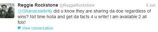 See below for Reggie Rockstone’s Tweet to me about the so called percentage arrangement